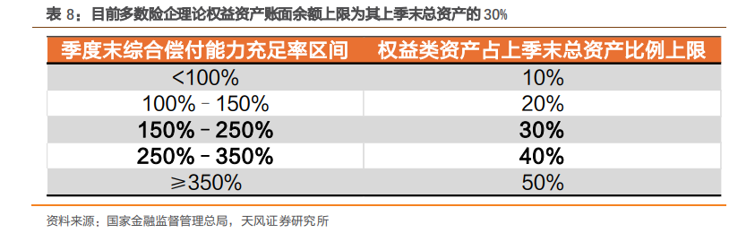二是用足权益类资产配置上限带来的提升空间。 4 月金融监管总局发布《关于调整保险资金权益类资产监管比例有关事项的通知》,简化档 位标准,并上调部分档位偿付能力充足率对应的权益类资产比例上限,进一步拓宽权益投 资空间。根据新规,上季末综合偿付能力充足率超过 150%低于 250%的保险公司,其权 益类资产配置上限为 30%。