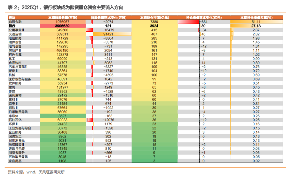 截止 2025Q1,从持仓市值来看,非银、银行、 公用事业为险资重仓的前三大行业,分别持仓 7380、3924、415 亿元,分别占全部持仓 市值 51.1%、27.2%、2.9%。其中,2025Q1 银行板块的险资重仓市值也环比提升 30 亿,为所有 wind 二级行业最高。从持股数量看,排名前三行业分别是银行、非银、交通 运输,银行板块持仓股票数量占险资总持仓 43%,是险资重仓持有的主力板块之一。 展望未来,中长期资金入市、险企长周期考核等政策导向影响下,我们预计险资对银行股 的配置力度或将延续提升势头。