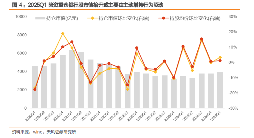 从实际公布数据来看,2025 年险资主动增加银行股配置的现象已逐渐显现。2025Q1 重 仓银行股市值单季环比增长 3.3%,拆分来看,持股均价仅增长 1.2%,而持股数量增长 2.1%。这说明险资重仓市值提升主要是由增持银行股驱动的,与 2024 年股价增长驱动的 原因有所不同。