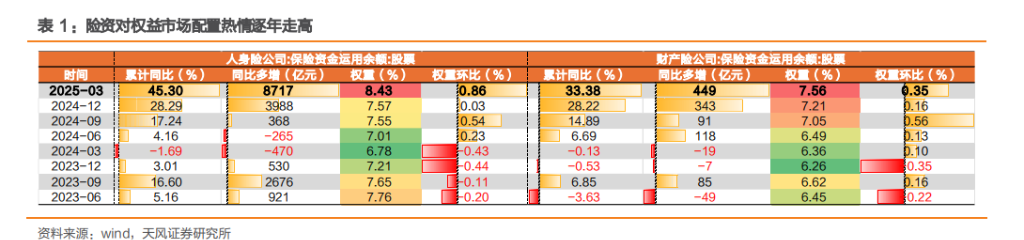 近年来险资配置股票的步伐加快。2025Q1末人身险和财产险公司在股票市场合计投资2.82万亿,同比增长44.5%,较2024年末提升19.5pct。