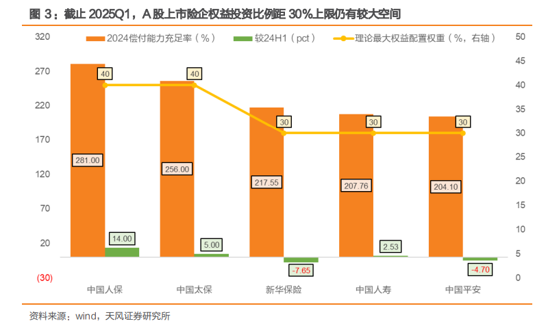 2025 年 3 月末保险行业整体综合偿付能力充足率为 204.5%,其中财产险公司、人身险 公司的综合偿付能力充足率分别为 239.3%、196.6%。因此,财产险、人身险行业内多 数公司的理论权益类资产配置上限为其上季末总资产的 30%。对于部分偿付能力充足率较 高的上市险企,其权益类资产配置上限可达到上季末总资产 40%。