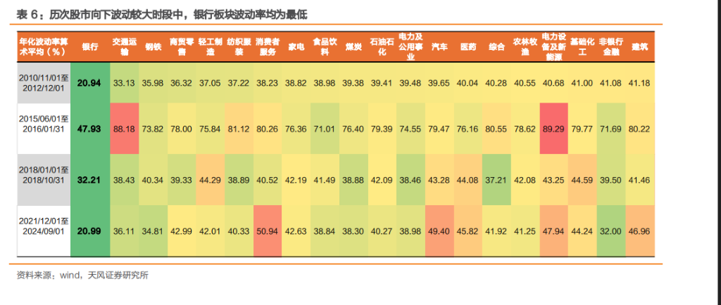 另一方面,银行股普遍市值较大,波动幅度相对较小。银行个股平均市值 3556 亿元,为 中信二级板块第一。复盘历史几次 A 股市场下行压力较大的周期来看,银行板块年化波动 率大体在 20%-48%的范围,为所有中信二级行业最低。